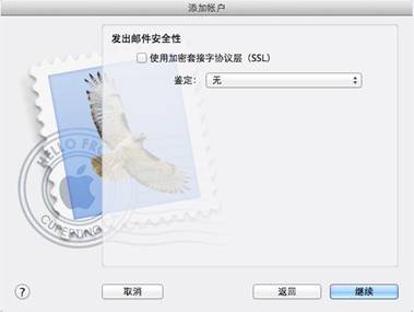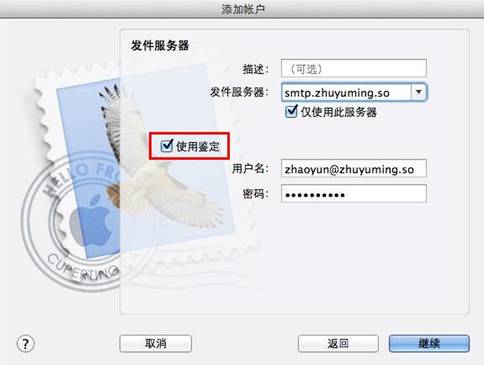 第四步:填寫發件服務器地址,【使用鑒定】處勾選。點擊【繼續】。