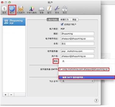 第八步:選擇【賬戶】中【密碼】屬性,找到剛設置的smtp服務器進行編輯。
